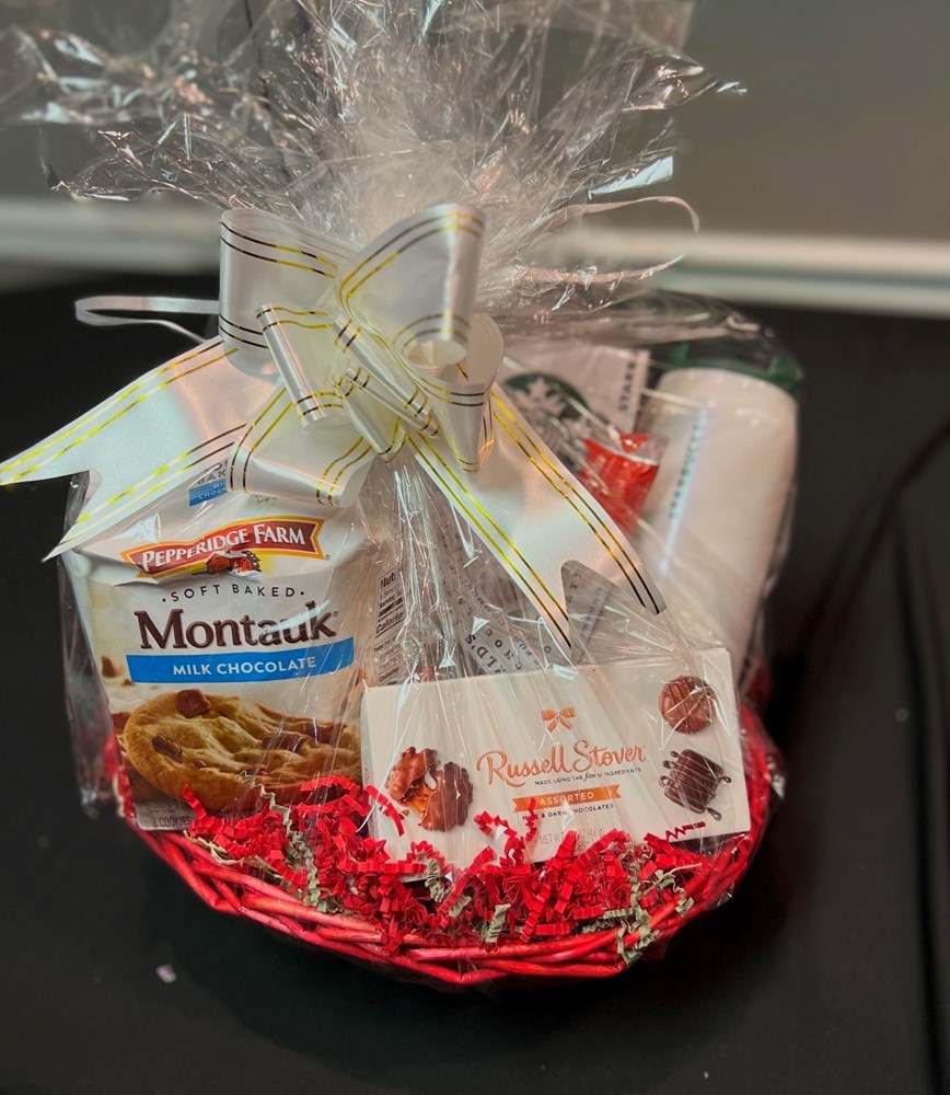 Inside this Starbucks basket: There's A hot and cold cup A $15 Starbucks card A bag of coffee A pack of cookies 3 worlds finest candy bars A mini pack of Russell stover chocolates