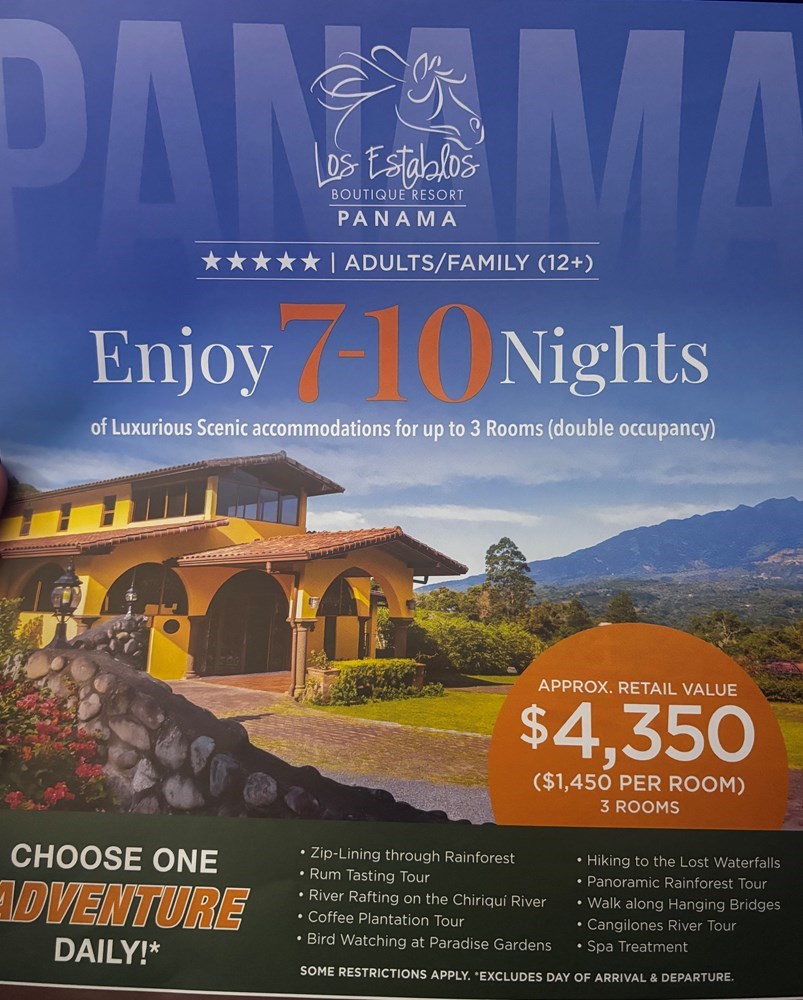 This is a beautiful trip Enjoy 7-10 Nights of Luxurious Scenic accommodations for up to 3 Rooms (double occupancy) located in the beautiful Boquete, Panama there is a Daily all/inclusive fee of $165 per day which provides 3 meals daily and beverages (including alcohol) and a choice of a daily adventure such as zip-lining through the rainforest, Rum-tasting tour, River Rafting , Hiking to the lost waterfalls, Spa treatment and so much more! Winner pays for Air fair
