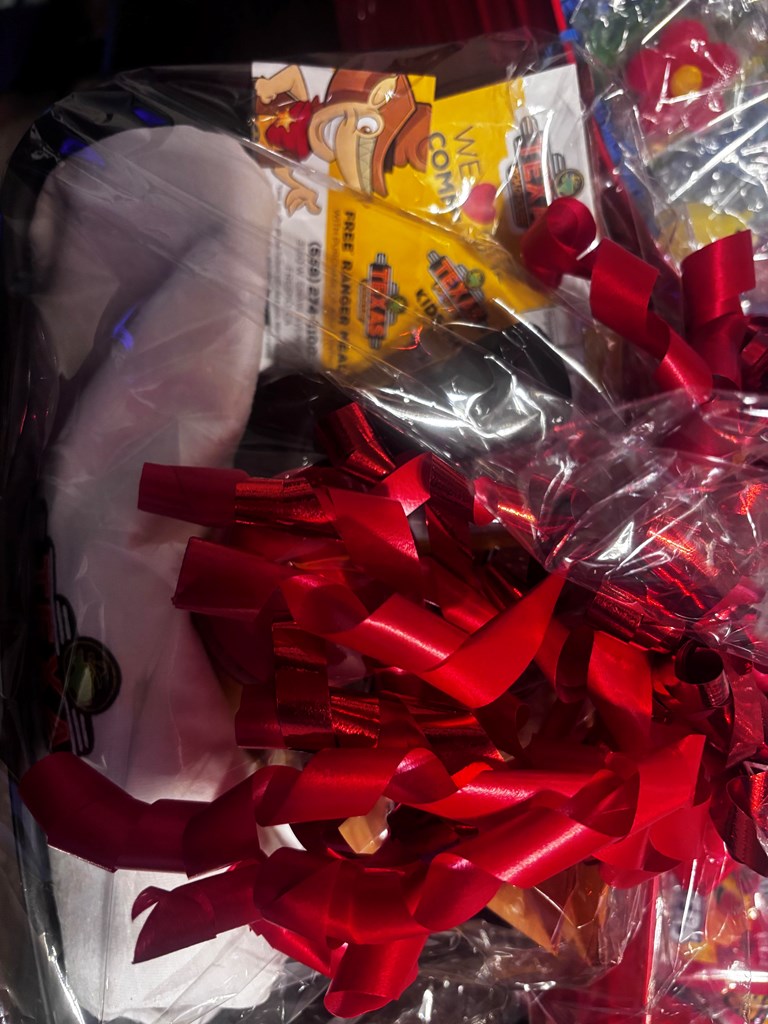 This basket has : -2 Entrees (up to $40) -1 Appetizer -1 Ranger meal -1kids meal -4 bags of Texas Roadhouse peanuts - A Tshirt -Seasoning -Steak sauce