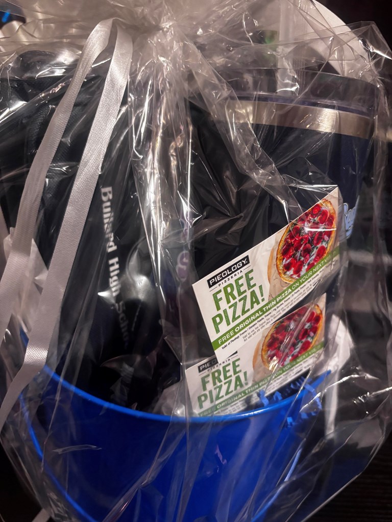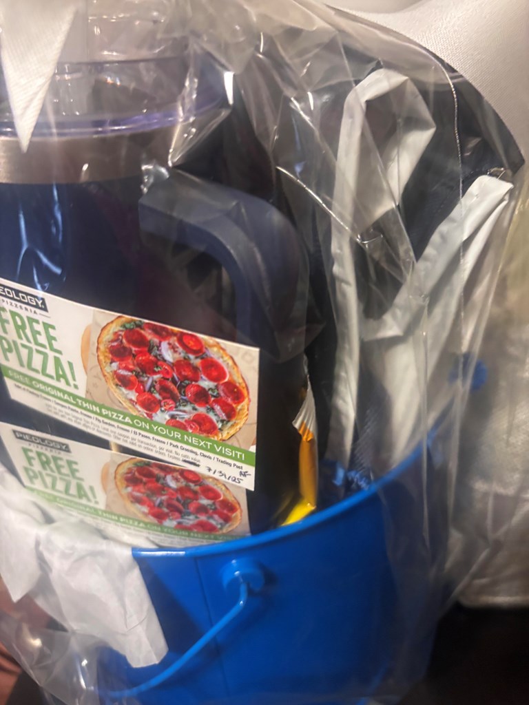 This is a Bullard basket with 4- original thin pizza tickets for pie-ology. Contains: 4-pieology pizza passes 1-Bullard high cup with lid and straw 1-Bullard High lunch bag 1-Bullard keychain Some candy