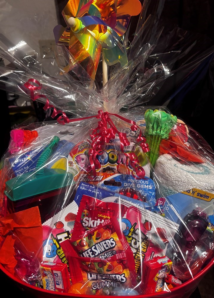 This is a summer fun basket with 2 Island waterpark tickets Basket includes: - 2 tickets to the island -A Towel -4 in 1 hammock raft -water balloons -watermelon cup -water wings for kids - 2 Beach ball -Dive Gems -Goggles -Dinosaur bubble blaster -a windmill -candy -